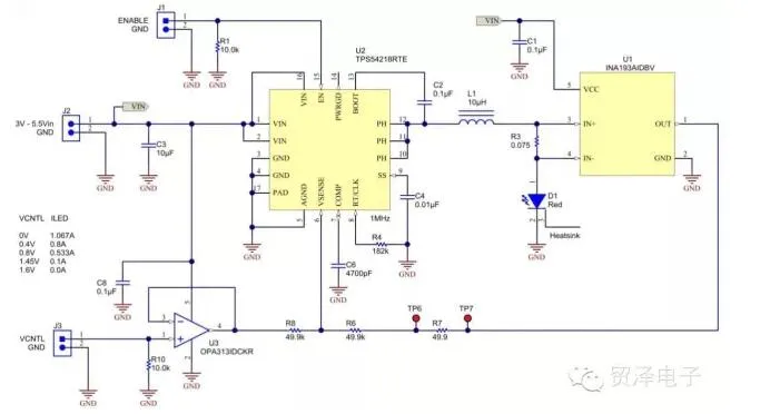 图1显示的是一个通过高侧感测电阻器R3直接驱动LED中电流的降压转换器,TPS54218,同步降压控制器。这个电流感测电压被电流感测监视器,INA193,放大20倍,这样可显著地降低R3中的功率耗散并提升效率。分流监视器的电流反馈信号输出给电阻分压器 (R6/R8),这形成了到VSENSE的完整反馈路径。
