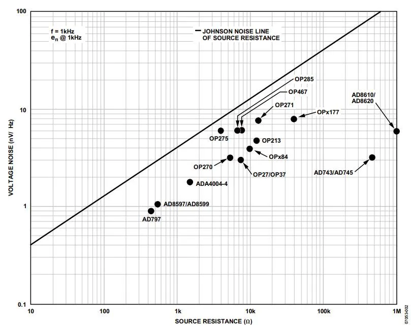 图1给出的是1 KHz下,多种ADI工高压(最高44 V)运算放大器的电压噪声密度对与RS, OP关系的比较,1 kHz。斜线显示了与电阻相关的约翰逊噪声。