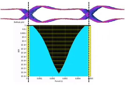 在最佳采样时刻,采样的误码率是最低的,而随着采样时刻向时间轴两侧的移动,误码率不断增大,如图6所示。所以工程上也经常画出信号采样周期内误码率的变化曲线,称为澡盆曲线(Bathtub Curve)。