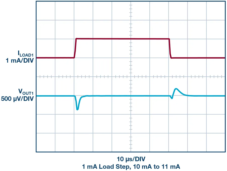 作为稳压器,LT6658从V<sub>OUT1_F</sub>引脚提供150 mA电流,并具有出色的瞬态响应性能。图2a显示了器件对1 mA负载阶跃瞬态(从10 mA到11 mA)的响应;图2b显示了器件对140 mA负载阶跃瞬态(从10 mA到150 mA)的响应。输出缓冲器的出电流和吸电流能力支持输出快速建立。瞬态响应时间很短,同时保持出色的负载调整。负载调整率典型值为0.1 ppm/mA。第二路输出V<sub>OUT2_F</sub>具有类似的响应性能,最大负载为50 mA。