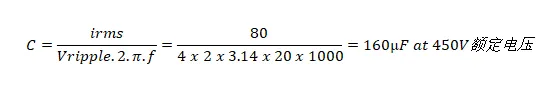 如果仅需要电容器来控制电动汽车动力系统等直流线路上的纹波电压,则在选择电容器时将会呈现显著不同。 总线电压可能与以前一样为400V,但由采用电池供电,因此不存在穿越需求。在下游转换器以20kHz的开关频率提取80Arms脉冲电流时,将纹波限制在4Vrms以内是非常现实的, 所需的电容是: