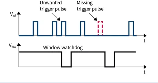 在一些关键的系统安全性的相关应用中,为满足系统对安全性更高的要求,稳压器提供了一种称作窗式看门狗的高级看门狗功能。窗式看门狗与标准看门狗的运行方式类似,但触发脉冲必须发生在特定的窗口或者说时间段内。如果触发脉冲发生在窗口外或者根本没有发生,窗式看门狗将复位单片机。当单片机发出不应产生的触发脉冲时,标准看门狗不能判断该触发是否有效。而窗式看门狗的窗口要求使其能检测出这类多余的触发事件。