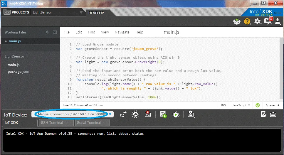 将 Grove 光传感器 JavaScript* 示例代码复制到适才创建的光传感器项目的 main.js 中。