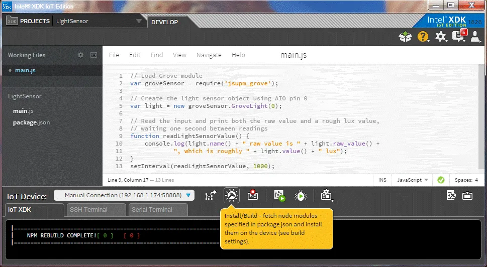 使用英特尔 XDK IoT Edition 构建并上传 LightSensor 项目。