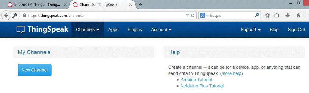 第一步是注册 ThingSpeak 账户:https://thingspeak.com/,然后创建一个新通道。