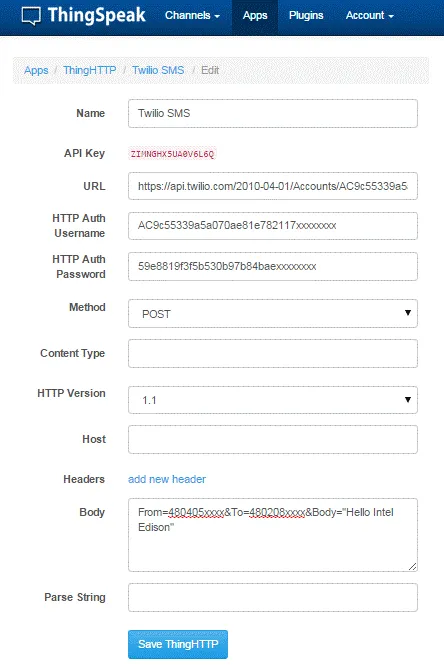 ThingHTTP 应用支持您通过 HTTP 请求将事物连接到 web 服务中。 ThingHTTP 的方法是 GET、POST、PUT 和 DELETE。 Twilio 也是用于短信和电话呼叫的云通信平台。 它还支持 HTTPs 方法,并且能够与采用英特尔® Edison 平台的 ThingHTTP 应用进行交互。 以下是借助 Twilio 通过 ThingHTTP 应用发送短信的示例。