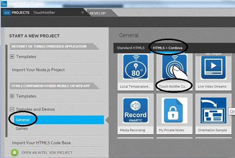 如要创建 Apache Cordova* 应用,请访问左侧的 HTML5 Companion Hybrid Mobile for Web App,然后点击 Samples and Demos,再点击 General。