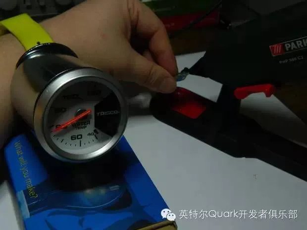组装部分比较简单。判断仪表线的正负极,笔者的仪表线是黑色和绿色,我们只需要将仪表线连接到5V电源上,从指针的转动方向即可判断仪表线的正负。
