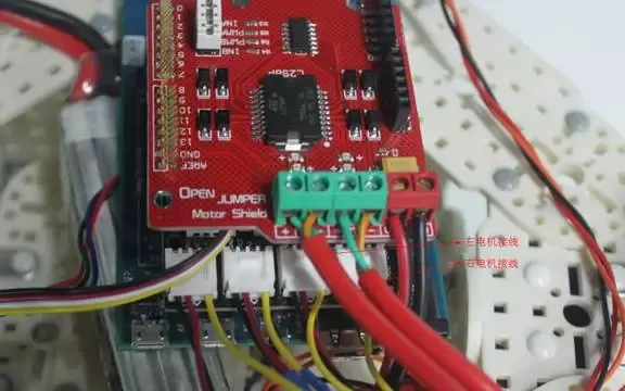 记得第一步里我们安装好的电机么?左侧轮子的电机的两根线连接到M1端口,右侧轮子的电机的两根线连接到M2端口,拧紧螺丝。这里不需要焊接,为了你的安全考虑,实际上整个套件里都不需要你使用危险的电烙铁。当你熟练掌握这一切之后,相信我,焊接不会花费你太多时间。