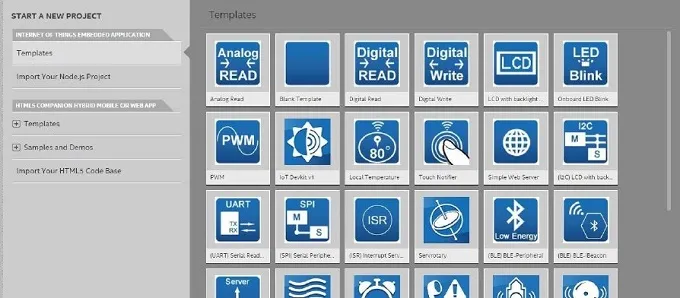 为了帮助您更好地入门,英特尔® XDK IoT Edition 提供各种 Node.js 模板和示例,可在英特尔® Edison 和英特尔® Galileo 开发板等英特尔® 物联网平台上运行。 这些模板有助于您轻松与连接至开发板的传感器和致动器进行交互。 图 1 所示为英特尔® XDK IoT Edition 中的模板视图快照。