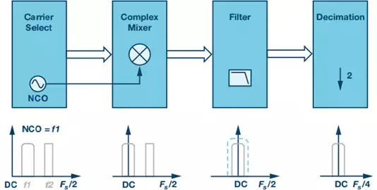 典型DDC模块包括载波选择、下变频器、滤波器和抽取器。这些功能模块按顺序工作,或者可分别予以旁路,最终根据后续FPGA或ASIC(其采样速率较低)的要求,产生一个位于DC的复信号或一个实信号。