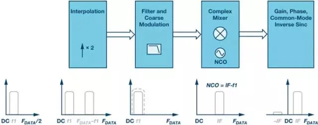 Tx链具有与Rx链相同的要求:需要高采样速率以简化滤波器设计,使信号频率位于高中频或直接变为射频,以及远远地推开镜像,但接口希望使用较低的数据速率。转换器的集成DUC将解决这些要求。