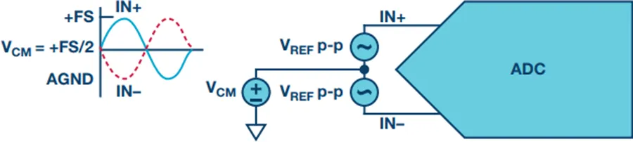 ADI提供两种带有差分输入的器件。本文介绍的第一种是差分反相。本例中,ADC转换ADC正负输入之间的差异,同时正负输入彼此180°反相摆动。通常,差分反相器件为单极性。因此,差分器件的每一侧将在低电压与正满量程(由基准电压输入设置)之间摆动。由于差分器件每一侧180°反相,输入共模固定。与伪差分器件相似,差分反相器件可限制其容许共模输入范围。此范围可在产品数据手册的规格表中找到。如下图7所示。对于ADC输入的绝对输入范围为0伏至正满量程的器件,共模电压为V FS/2。大多数情况下,对于高分辨率(16位及更高)差分反相SAR ADC,共模电压范围为典型共模电压±100 mV。