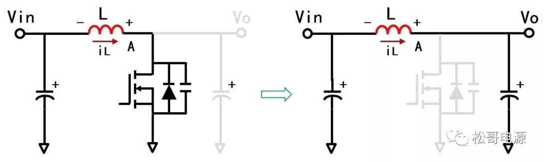 图中的A点,当电感激磁储能时,其连接到输入电源的地;当电感的感应电压叠加到输入电压时,其连接到输出端,A点是一个动点,有时连接到地,有时连接到输出,因此,A点和地、输出之间,需要各加一个可以进行连通和断开的开关元件,实现这个功能。