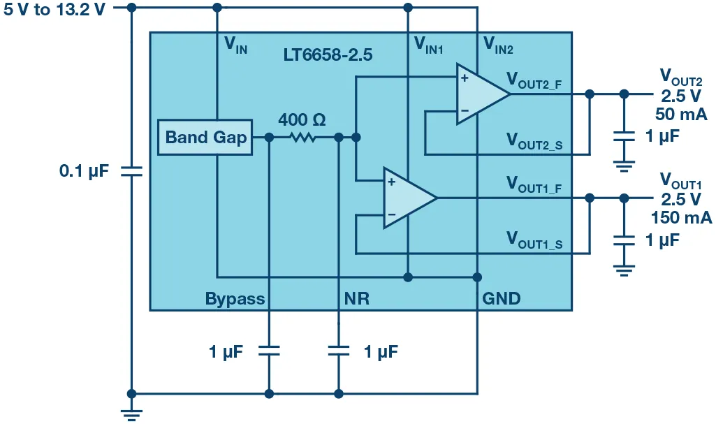 任何设计流程通常都涉及到精度与功耗的选择。为了做出选择,粗略方法建议:当要求精度时使用基准电压源,当要求毫瓦级功耗时使用LDO。除了需要额外的电路板空间和成本以外,还必须为不同的信号布线,无论其标称电压相同与否。如果需要一个高精度电压源来提供毫瓦级功耗,设计人员将不得不缓冲基准电压源。LT6658通过提供两路低噪声、高精度输出来解决这一难题,其合并输出电流为200 mA,且具有世界一流的基准电压源规格。