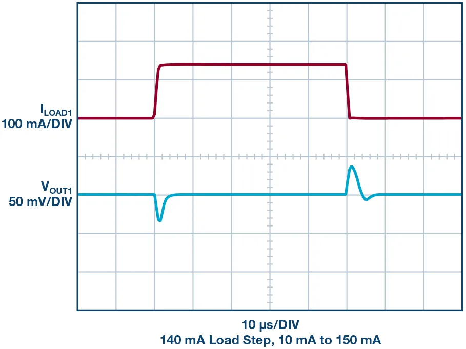 作为稳压器,LT6658从V<sub>OUT1_F</sub>引脚提供150 mA电流,并具有出色的瞬态响应性能。图2a显示了器件对1 mA负载阶跃瞬态(从10 mA到11 mA)的响应;图2b显示了器件对140 mA负载阶跃瞬态(从10 mA到150 mA)的响应。输出缓冲器的出电流和吸电流能力支持输出快速建立。瞬态响应时间很短,同时保持出色的负载调整。负载调整率典型值为0.1 ppm/mA。第二路输出V<sub>OUT2_F</sub>具有类似的响应性能,最大负载为50 mA。