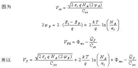 在阈值电压的表示式中,与掺杂浓度和温度有关的因素主要是半导体Fermi势ψB。当p型半导体衬底的掺杂浓度NA提高时,半导体Fermi能级趋向于价带顶变化,则半导体Fermi势ψB增大,从而就使得更加难以达到ψs≥2ψB的反型层产生条件,所以阈值电压增大。