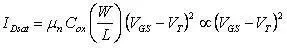 在VGS>VT时,出现沟道,但如果源-漏电压VDS=0,则不会产生电流;只有在VGS>VT和VDS>0时,才会产生电流,这时必然有VDS >(VGS-VT),因此MOSFET处于沟道夹断的饱和状态,于是源-漏电流随栅-源电压而平方地上升。相应地,饱和跨导随栅-源电压而线性地增大,这是由于饱和跨导与饱和电压(VGS-VT)成正比的缘故。