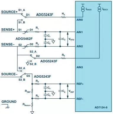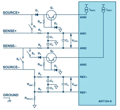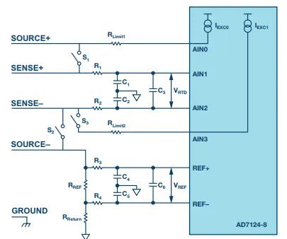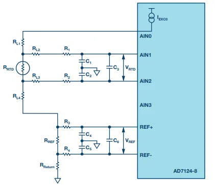 图7显示了该方法的示意图,R1至R4分别位于AIN1、AIN2、REF+和REF–的前面。此设置用于消除噪声。同时,这些电阻可以用于限流;在AIN0和AIN3前面增加限流电阻可以保护AD7124的其余裸露模拟引脚。