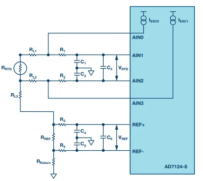 比率测量法被广泛的用于 RTD 模块,因为它能消除激励电流源的误差和漂移。图 1 是基于 AD7124-8 的 4 线 RTD 测量的典型示意图。