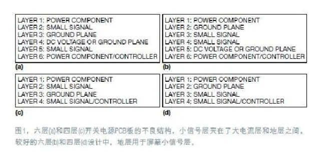 图1a和1c分别是六层和四层开关电源PCB的不良层结构。这些结构将小信号层夹在大电流功率层和地层之间,因此增加了大电流/电压功率层与模拟小信号层之间耦合的电容噪声。