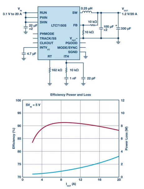 图1显示使用LTC7150S,开关频率为1MHz时,为SoC和CPU供电的20 A、1.2 V输出解决方案。该电路非常易于修改,以适应其他的输出组合,包括3.3 V、1.8 V、1.1 V和0.6 V,从而充分利用LTC7150S的宽输入范围。LTC7150S具有可作为第一级5 V电源的输出电流能力,支持后接多个不同输出的后端二级开关稳压器或LDO稳压器。