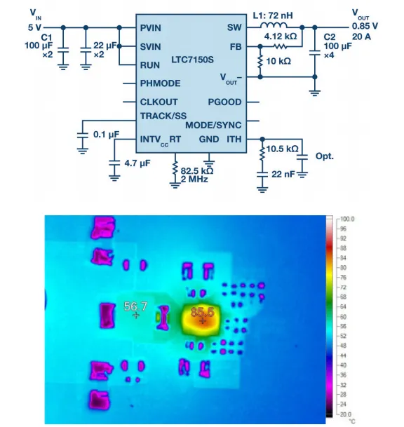 <center><img src="http://mouser.eetrend.com/files/2018-12/wen_zhang_/100016147-54199-ad4…; alt=“图4. LTC7150S原理图和5 V输入至0.85 V/20 A输出,fSW = 2 MHz时的热性能像。” width="600"></center><center><i>图4. LTC7150S原理图和5 V输入至0.85 V/20 A输出,fSW = 2 MHz时的热性能像。</i></center>