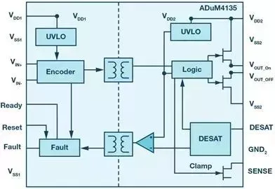 <center><img src="http://mouser.eetrend.com/files/2019-07/wen_zhang_/100044032-73988-1.pn…; alt=“图1:隔离式栅极驱动器ADuM4135的简化原理图” width="600"></center><center><i>图1:隔离式栅极驱动器ADuM4135的简化原理图</i></center>