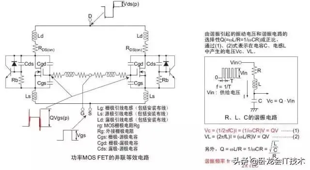 在并联功率MOSFET时未插入栅极电阻而直接连接时发生栅极寄生振荡。高速反复接通、断开漏极-源极电压时,在由栅极-漏极电容Cgd(Crss)和栅极引脚电感Lg形成的谐振电路上会发生此寄生振荡。当谐振条件(ωL=1/ωC)成立时,hn会在栅极-源极间外加远远大于驱动电压Vgs(in)的振动电压,由于超出栅极-源极间额定电压而导致栅极破坏,或者接通、断开漏极-源极间电压时的振动电压通过栅极-漏极电容Cgd和Vgs波形重叠导致正向反馈,因此可能会由于误动作引起振荡破坏。