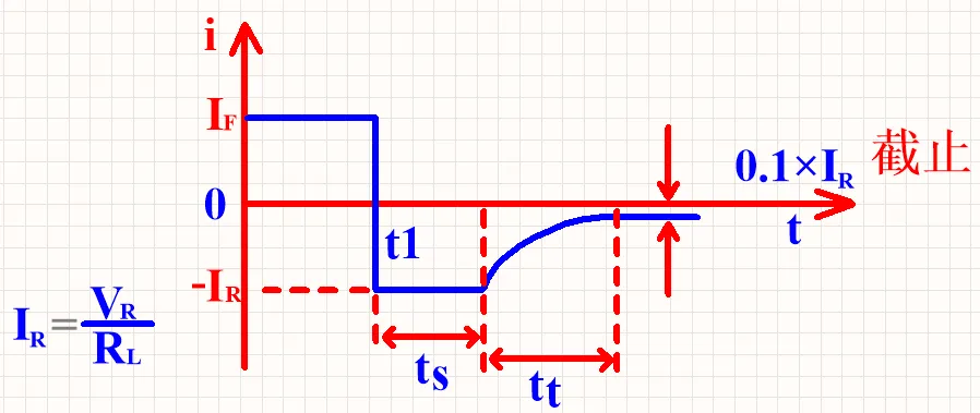 由上可知,二极管在开关转换过程中出现的反向恢复过程,实质上由于电荷存储效应引起的,反向恢复时间就是存储电荷消失所需要的时间。