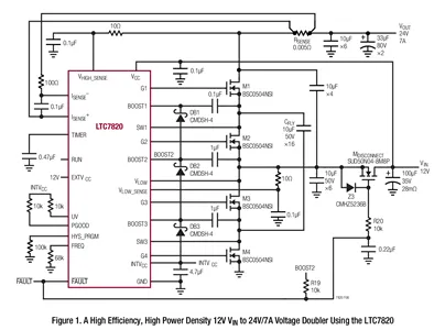 <p><em><span><span>图 1:一款采用 LTC7820 的高效率、高功率密度 12V VIN 至 24V/7A 倍压器</span></span></em></p>