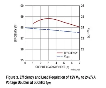 <p><span>尽管基于 LTC7820 的倍压器是开环转换器,但是 LTC7820 的高效率保持了严紧的负载调节。如图 3 所示,在满负载时的输出电压仅下降 0.43V (1.8%)。</span></p>