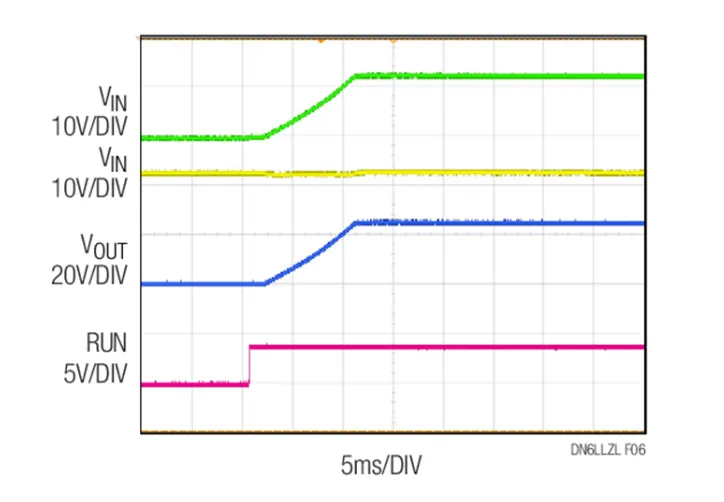 <p><span>输入的转换速率控制可通过在输入端上采用一个断接 FET 或使用热插拔控制器来实现,如 LTC7820 产品手册中的典型应用部分所示。在图 1 中,输入端上采用了一个断接 FET。与分压器解决方案不同,倍压器每次都必须从零输入电压启动,但是它能在具有重负载时直接启动。图 4 示出了在 7A 负载条件下的启动波形。</span></p>