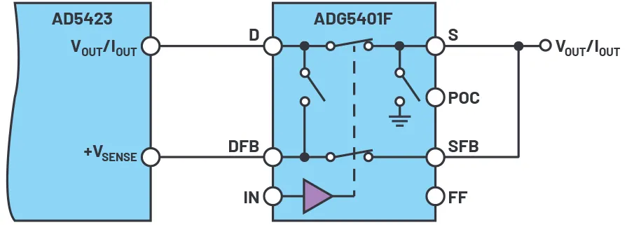<p><span>ADG5401F过压保护SPST开关用在AD5423 DAC的模拟输出上,在通电和无电状态下均能提供过压保护。ADG5401F的源极(S)和源反馈(SFB)引脚可承受最高±60 V的过压。</span></p>
