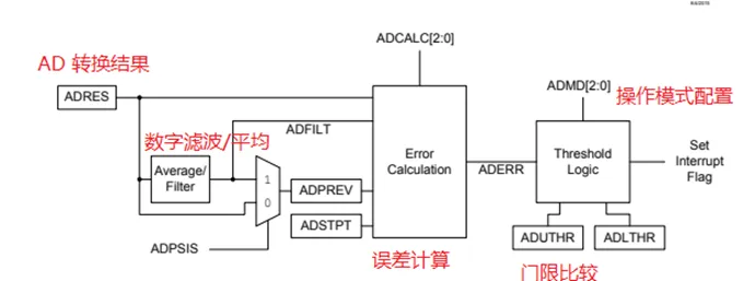 <p><span>创新的ADC设计,使得ADC自身具有转换后的计算功能,可以对ADC</span><span>转换</span><span>的数据进行复杂的运算,而无需CPU干预。使用这种具有运算能力的智能ADC, 在转换完成后, 结果可以通过预定的计算功能来传递,将不需要编写代码来查看ADC结果是否落在某个窗口之内或之外,也可以直接获取ADC平均样本值或者滤波器样本数据值等。这种计算由ADC外设本身执行,加速了通常由软件完成的算术任务,不再需要占用CPU资源和额外的RAM缓冲空间。例如,如下图PIC</span><span>®</span><span><span> </span>Q10系列MCU上ADC的计算功能简化框图所示, 可以通过配置ADC的ADMD位来控制ADC计算模块以选择五种不同的操作模式之一</span><span>:</span><span>基本模式</span><span>、</span><span>累加模式</span><span>、</span><span>平均模式</span><span>、</span><span>突发平均模式和低通滤波器模式等。</span></p>