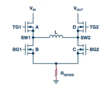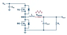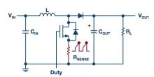 对于降压调节器,电流检测电阻有多个位置可以放置。当放置在顶部MOSFET的高端时(如图1所示),它会在顶部MOSFET导通时检测峰值电感电流,从而可用于峰值电流模式控制电源。但是,当顶部MOSFET关断且底部MOSFET导通时,它不测量电感电流。