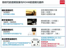 “ROHM半导体已经有近60年历史,在如今高清音频时代我们推出了这款芯片,我们相信它会成为中国不断普及的、最先进的、支持高分辨率的音频SoC产品之一。罗姆拥有非常多年的模拟工程的技术积累,这也是我们能够开发出这样产品的背景。罗姆多年来一直对声音有不懈地追求。”ROHM半导体(深圳)有限公司董事长竹内善行先生(题图)在发布会上指出,“大家熟悉的雅马哈、天龙等知名发烧级影音功放里的音频芯片,都出自ROHM半导体!ROHM半导体的发展可谓伴随着音频技术的不断进步! ”下图显示了ROHM音频器件在各个音频时代设备上的采用情况